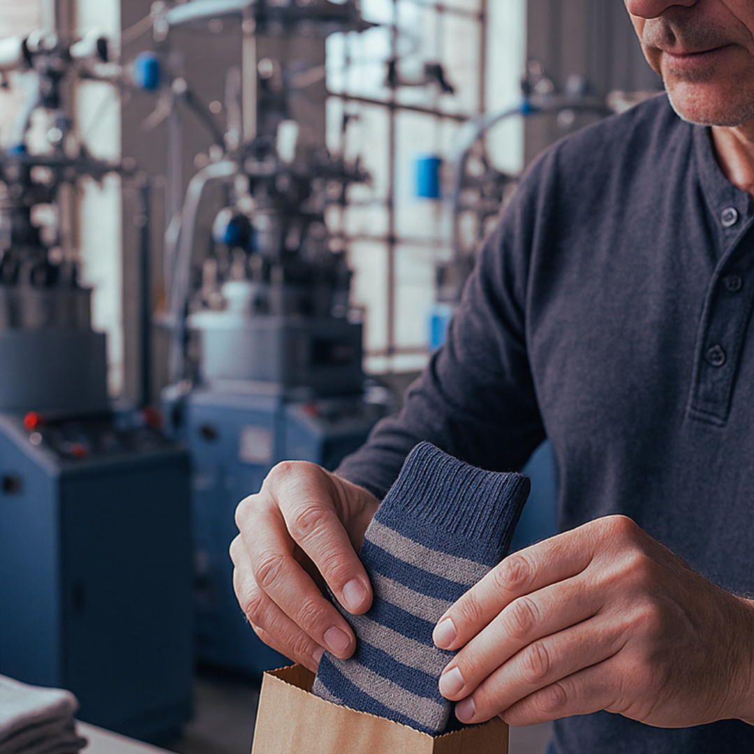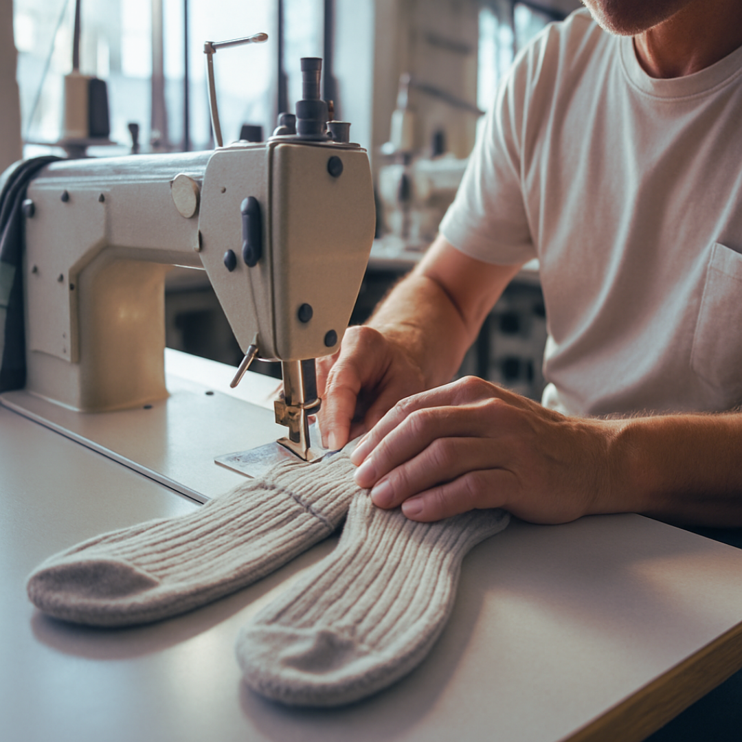 Sewing high-quality socks involves circular knitting using fine-gauge needles, reinforced heel and toe construction, hand-linked toe seams for comfort, and meticulous quality control to ensure durability, elasticity, and a premium finish.